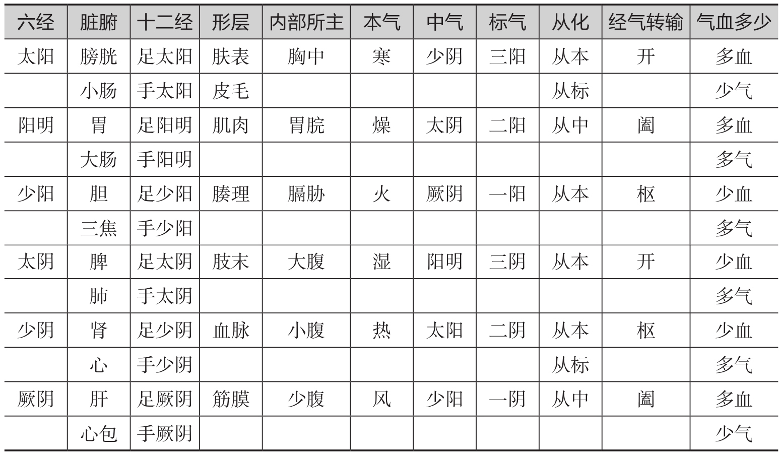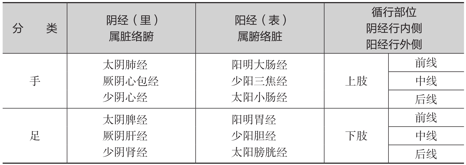 表1-1-2 三阴三阳标志十二经脉及其与脏腑络属的关系表