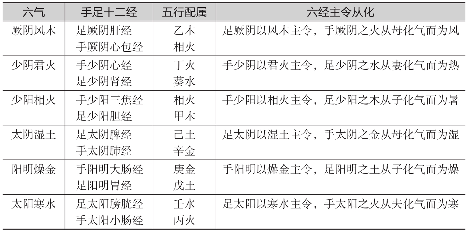 《素问·天元纪大论》曰:“子午之岁,上见少阴;丑未之岁,上见太阴;寅申之岁,上见少阳;卯酉之岁,上见阳明;辰戌之岁,上见太阳;巳亥之岁,上见厥阴。少阴所谓标也,厥阴所谓终也。”此以地支纪岁,标志不同年份的六气特点。《素问·六微旨大论》:“少阳之右,阳明治之;阳明之右,太阳治之;太阳之右,厥阴治之;厥阴之右,少阴治之;少阴之右,太阴治之;太阴之右,少阳治之。”明确地指出了六气随时间变化而变化之规律。