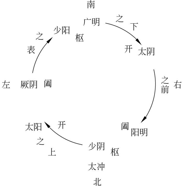 《素问·阴阳离合论》:“帝曰:愿闻三阴三阳之离合也。岐伯曰:圣人南面而立,前曰广明,后曰太冲。太冲之地,名曰少阴,少阴之上,名曰太阳,太阳根起于至阴,结于命门,名曰阴中之阳。中身而上,名曰广明,广明之下,名曰太阴,太阴之前,名曰阳明,阳明起于厉兑,名曰阴之绝阳。厥阴之表,名曰少阳,少阳根起于窍阴,名曰阴中之少阳。是故三阳之离合也,太阳为开,阳明为阖,少阳为枢。三经者,不得相失也,搏而勿浮,命曰一阳。帝曰:愿闻三阴。岐伯曰:外者为阳,内者为阴,然则中为阴,其冲在下,名曰太阴,太阴根起于隐白,名曰阴中之阴。太阴之后,名曰少阴,少阴根起于涌泉,名曰阴中之少阴。少阴之前,名曰厥阴,厥阴根起于大敦,名曰阴中之绝阴。是故三阴之离合也,太阴为开,厥阴为阖,少阴为枢。三经者,不得相失也,搏而勿沉,名曰一阴。阴阳 !img !img ,积传为一周,气里形表而为相成也。”(图1-1-4)